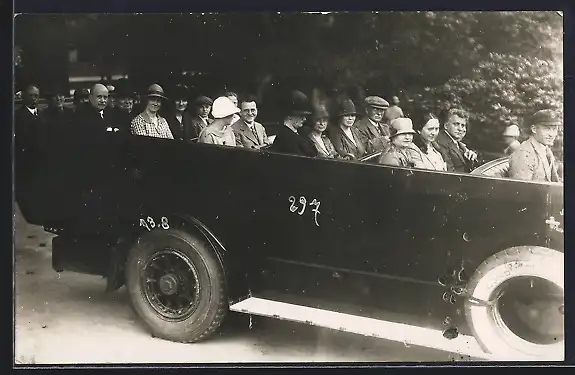 Foto-AK Vollbesetzter Autobus mit offenem Verdeck