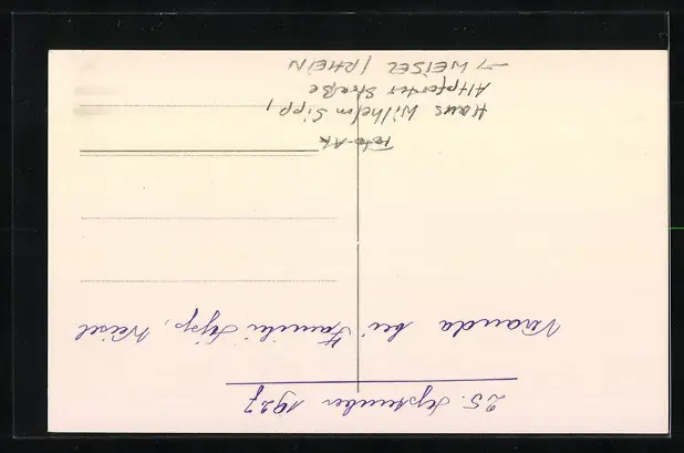 Personenbezogene Daten auf der Rückseite der Karte wurden durch blauen Textmarker unkenntlich gemacht. Die blauen Stellen sind auf die Vorderseite durchgeweicht und wirken sich negativ auf das Postkartenfoto aus