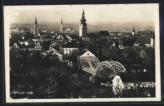 Foto-AK Wels, Totalansicht mit Brücke