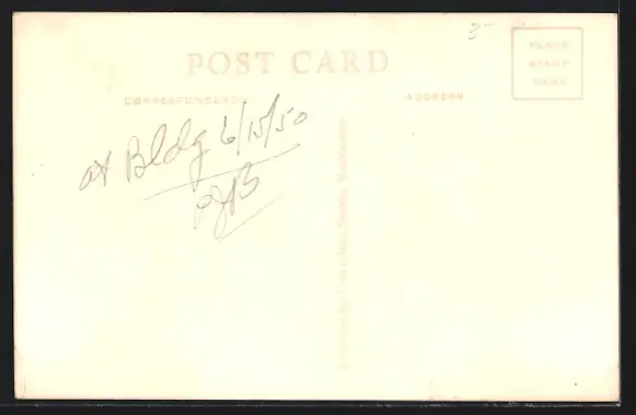 Personenbezogene Daten auf der Rückseite der Karte wurden durch blauen Textmarker unkenntlich gemacht. Die blauen Stellen sind auf die Vorderseite durchgeweicht und wirken sich negativ auf das Postkartenfoto aus