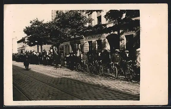 Foto-AK Wien, Radfahrer bei einem Umzug in der Dingestedtgasse