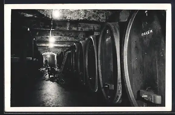 Foto-AK Winzer beim Umfüllen riesieger Weinfässer mit einer Pumpe