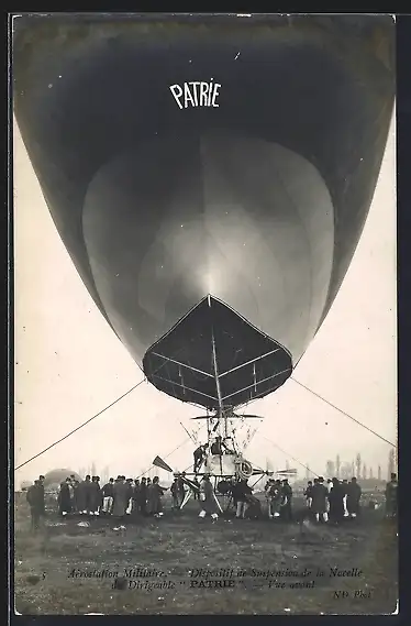 Foto-AK Zeppelin Patrie vor dem Abflug an Seilen