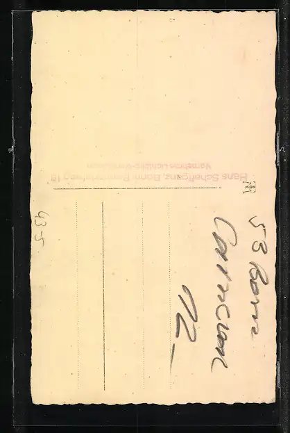 Personenbezogene Daten auf der Rückseite der Karte wurden durch blauen Textmarker unkenntlich gemacht. Die blauen Stellen sind auf die Vorderseite durchgeweicht und wirken sich negativ auf das Postkartenfoto aus