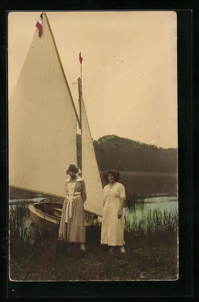 Foto-AK Zwei Schwestern an einem Segelboot