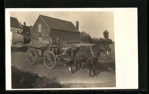 Foto-AK Zwei Soldaten auf einem Pferdegespann vor einem Gehöft