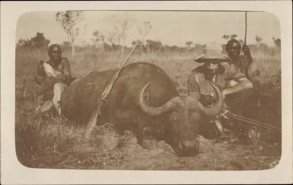 Foto Ak Afrika, Jäger mit erlegtem Büffel