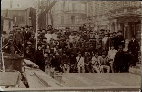 Foto Ak Arbeiter in einem Ort, Straßenbau ?, Zigarrenhandlung