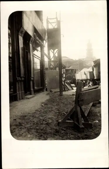 Foto Ak Baustelle, Kirchturm im Hintergrund