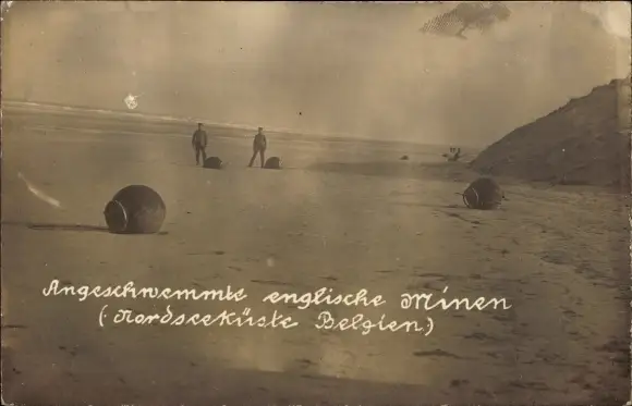 Foto Ak Belgien, Am Strand angeschwemmte englische Minen, I WK