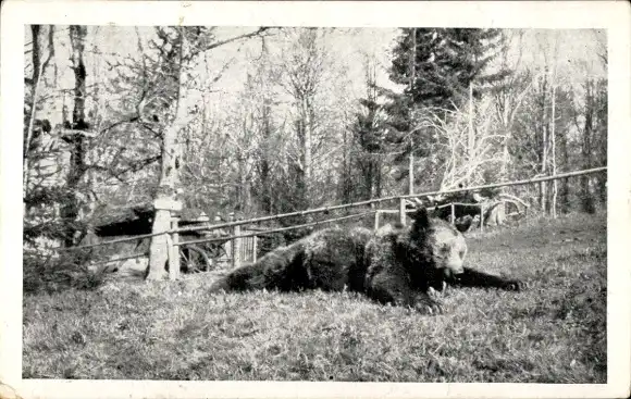 Foto Ak Braunbär, Wiese, Wald, Fuhrwerk