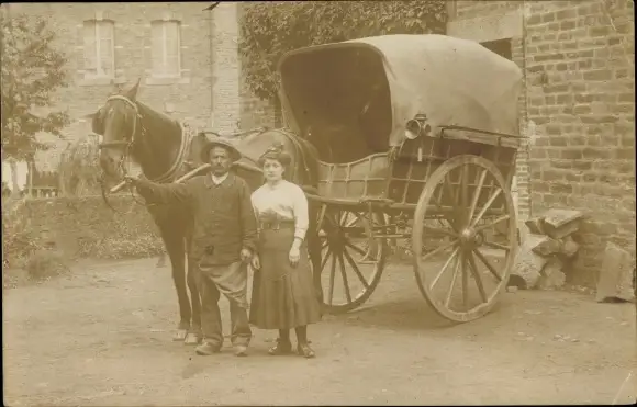 Foto Ak Condé sur Noireau Calvados, Mann und Frau mit einer Kutsche