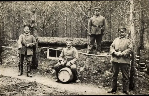 Foto Ak Deutsche Soldaten in Uniform vor einem Unterstand, I. WK