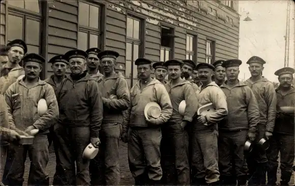 Foto Ak Deutsche Soldaten in Uniformen, Soldaten stehen an, Essenausgabe, I. WK