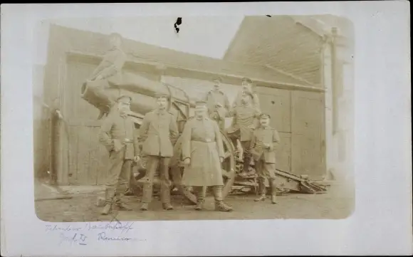 Foto Ak Deutsche Soldaten in Uniformen auf einem Geschütz, I. WK