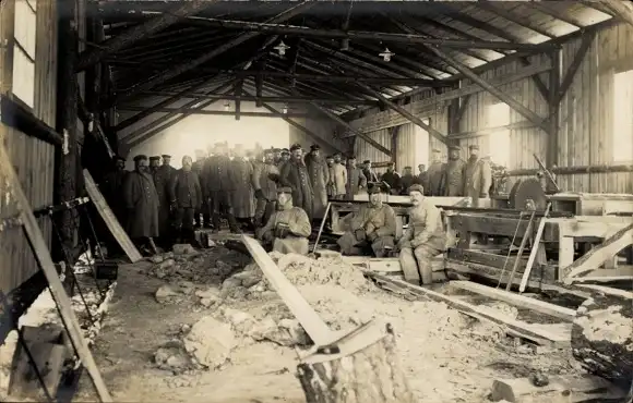 Foto Ak Deutsche Soldaten in Uniformen in einem Sägewerk