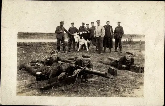Foto Ak Deutsche Soldaten in Uniformen mit Maschinengewehr, Kuh
