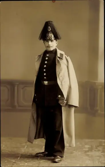Foto Ak Deutscher Soldat in Uniform, Federbusch, Mantel