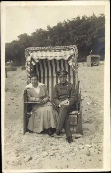 Foto Ak Deutscher Soldat in Uniform, Mit Frau in einem Strandkorb sitzend