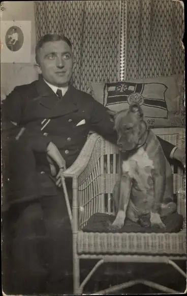 Foto Ak Deutscher Soldat in Uniform, Portrait, Hund auf einem Korbstuhl