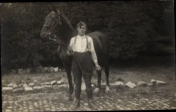 Foto Ak Deutscher Soldat in Uniform, Portrait mit Pferd