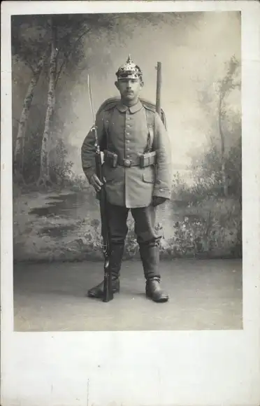 Foto Ak Deutscher Soldat in Uniform, Standportrait, Ausrüstung, Bajonett