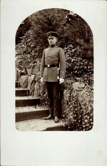 Foto Ak Deutscher Soldat in Uniform auf einer Treppe, Portrait