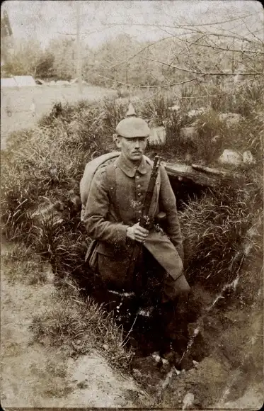 Foto Ak Deutscher Soldat in Uniform in einem Graben