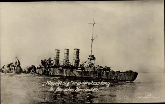 Foto Ak Deutsches Kriegsschiff SMS Magdeburg, Zerstörung I. WK