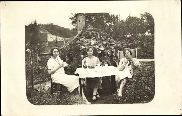 Foto Ak Drei Frauen an einem Tisch im Garten