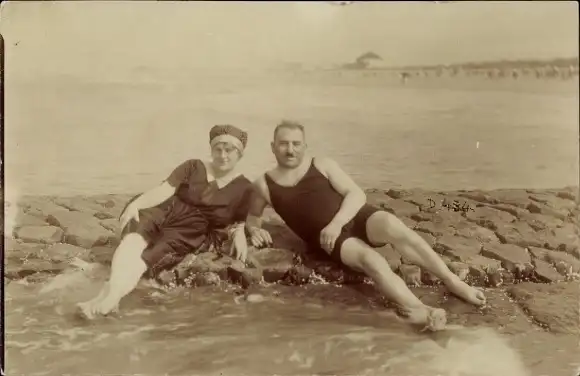 Foto Ak Ehepaar am Strand, Bademode, Badeanzug