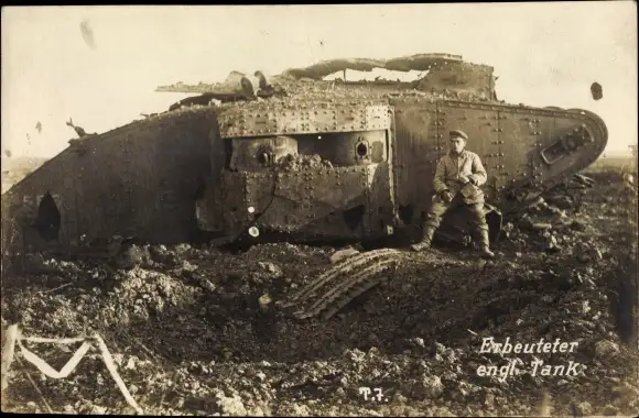 Foto Ak Erbeuteter englischer Tank, Soldat vor einem Panzer, I WK