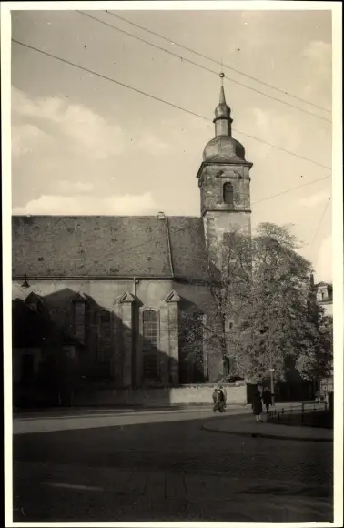 Foto Ak Erfurt Thüringen, Straßenpartie mit Blick auf die Neuwerkskirche