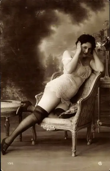 Foto Ak Erotik, Frau in Unterwäsche auf einem Sessel, Strümpfe
