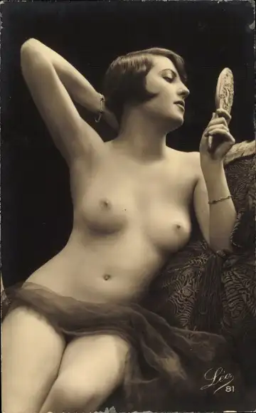 Foto Ak Erotik, nackte Frau mit einem Handspiegel, Busen