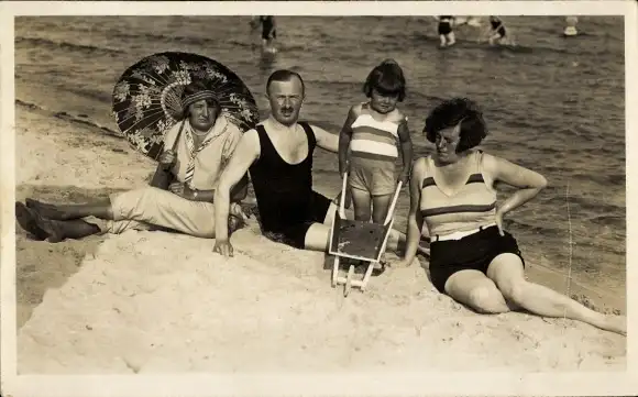 Foto Ak Familie am Strand, Bademode, Sonnenschirm, Kind, Schubkarre