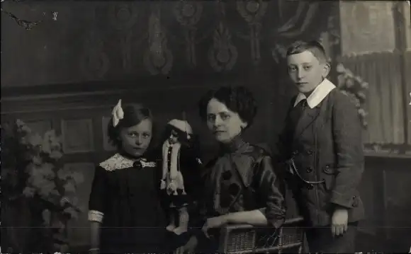 Foto Ak Familienbild, Frau mit Kindern, Puppe