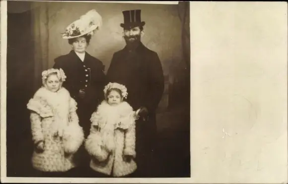 Foto Ak Familienportrait, Pelzmode, Zylinder, Hut