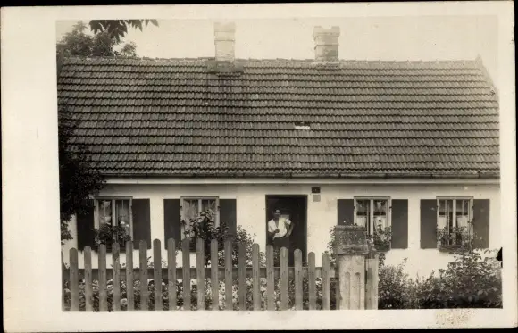 Foto Ak Feldmoching München Bayern, Wohnhaus, Anwohner in der Tür, Vorgarten