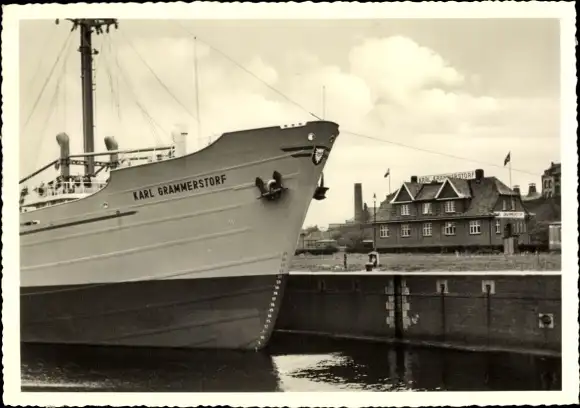 Foto Ak Frachtschiff Karl Grammerstorf im Hafen, Reedereigebäude