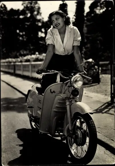 Foto Ak Frau mit Motorrad, Motorroller Moto Guzzi Galletto