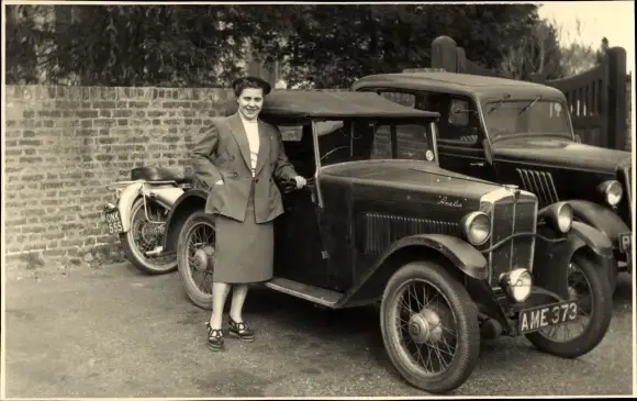 Foto Ak Frau vor einem Automobil, KFZ Kennz. AME 373