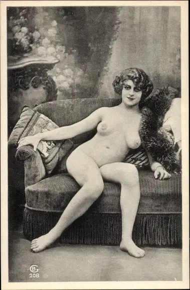 Foto Ak Frauenakt, Busen, Beine, sitzend, Sofa