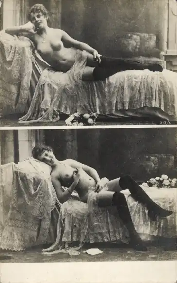 Foto Ak Frauenakt, liegend, Strümpfe
