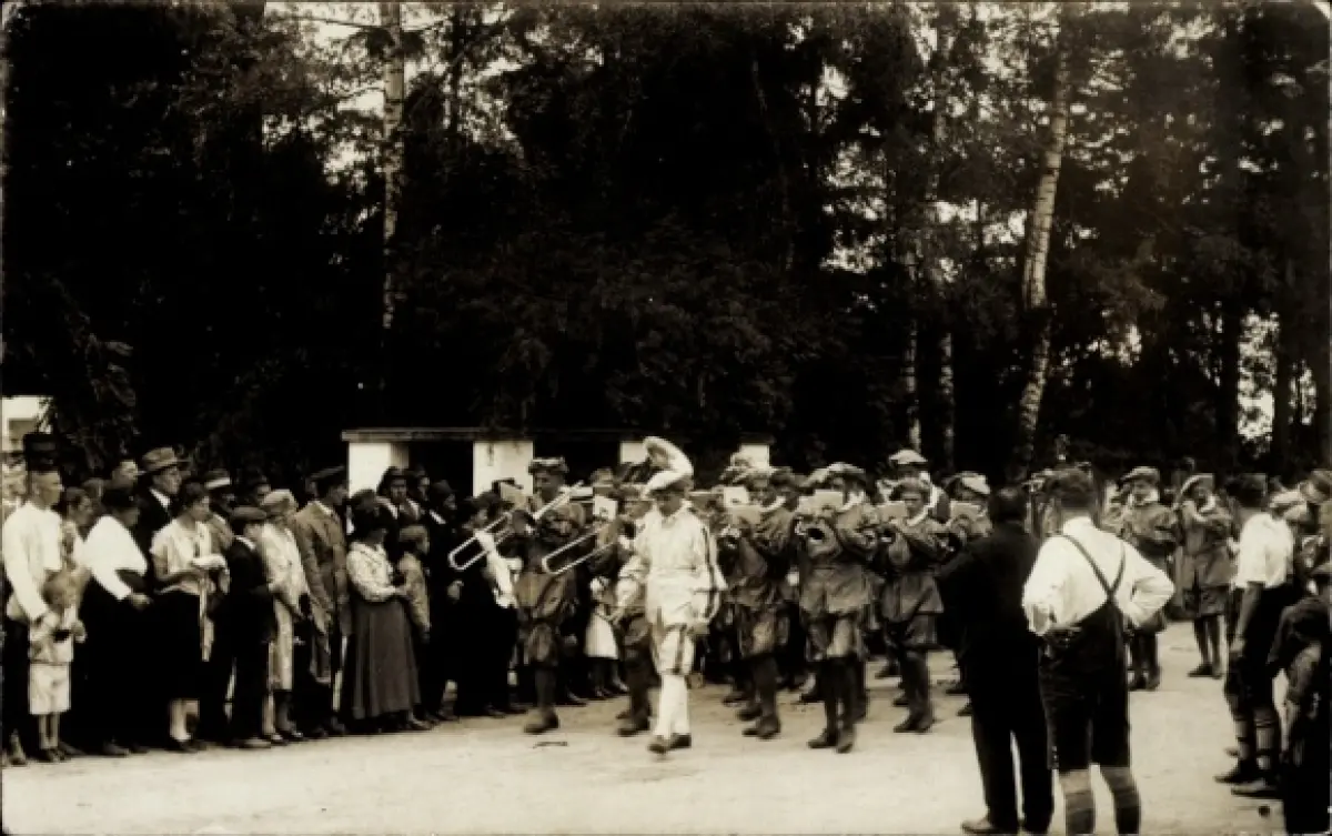 Foto Ak Friedberg? Festzug, Marschkapelle in historischen Kostümen, Fotograf Eugen Rueß