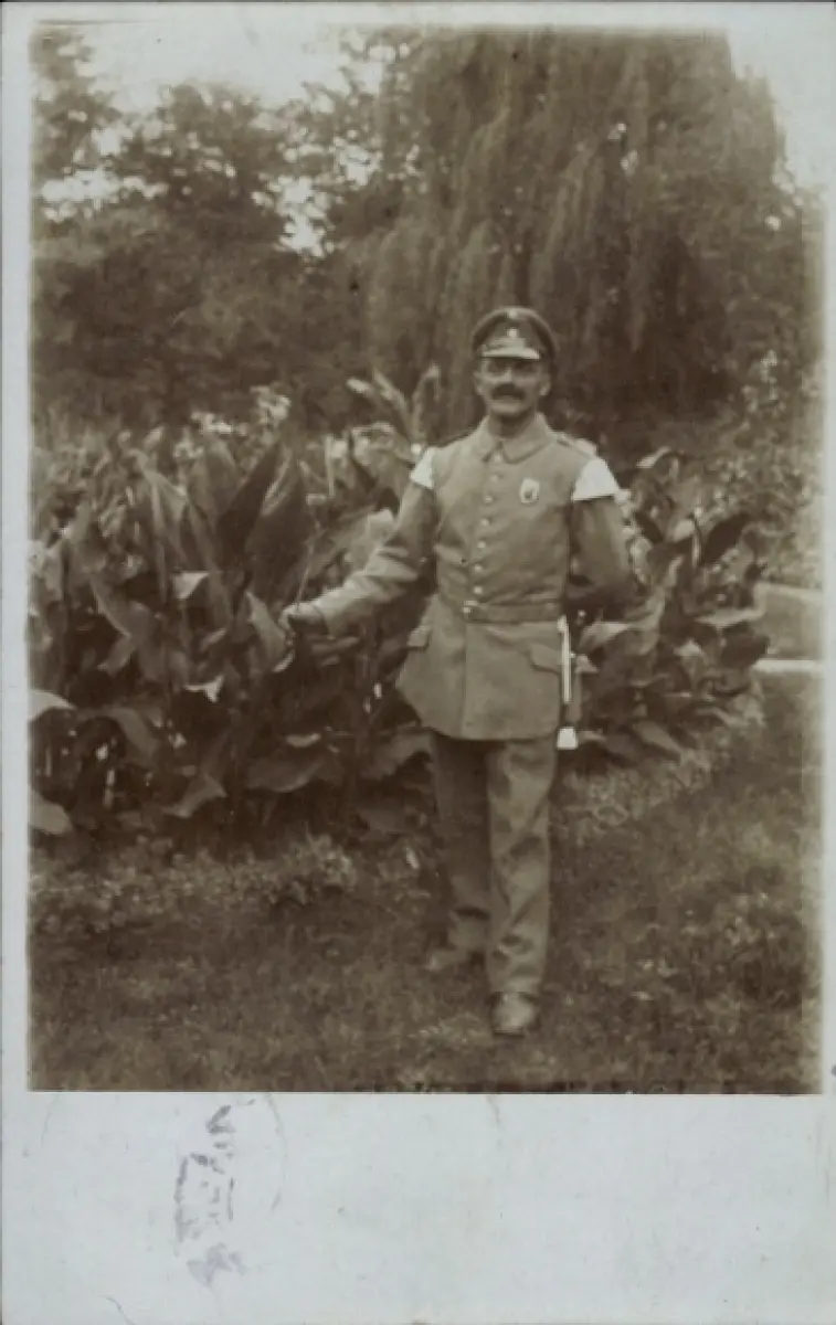 Foto Ak Gießen, Deutscher Soldat in Uniform, Standportrait in einem Garten