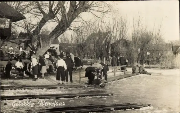 Foto Ak Glückwunsch Neujahr, Personen an einem zugefrorenen Gewässer