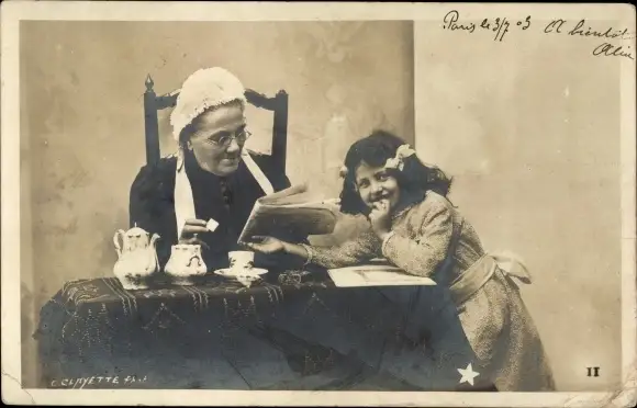Foto Ak Großmutter liest Zeitung, Enkelin möchte Zuckerstück haben