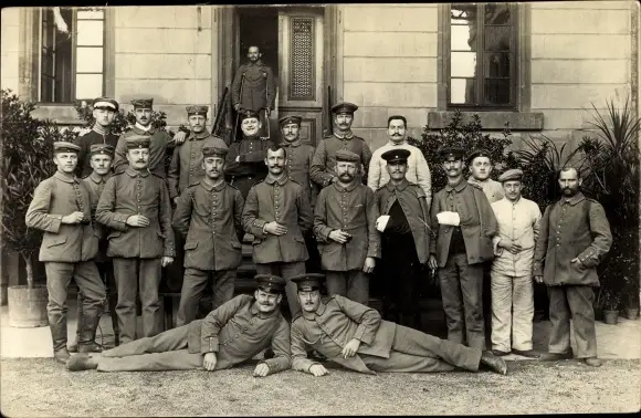 Foto Ak Gruppenbild mit Soldaten in Uniform vor einem Lazarett