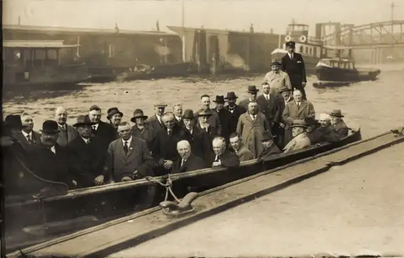 Foto Ak Hamburg, Männer im Boot, Gruppenbild, Dampfer, Hafen